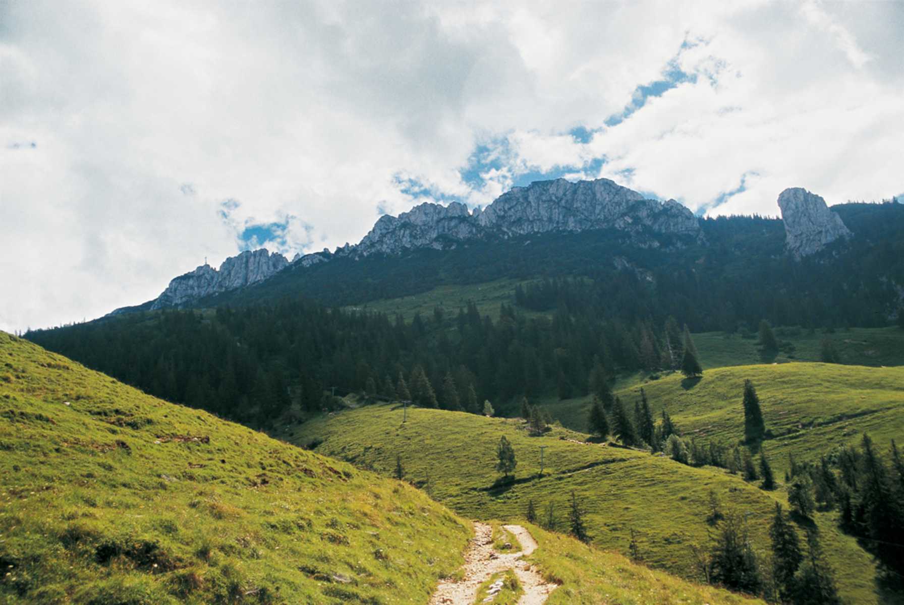 Von hier führt ein aussichtsreicher und viel begangener Weg leicht bergan in Richtung Sonnenalm, 1.467 m, die direkt oberhalb der Bergstation der Kampenwandbahn liegt.