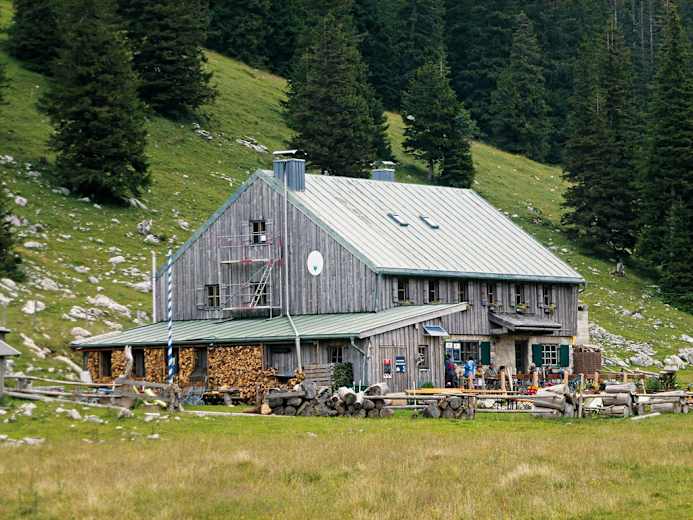 Wir starten auf der Hochrieshütte, 1.568 m, über die breite Nordostseite des Berges hinab zu einem Wegkreuz (1.356 m) in der Nähe der Riesenalm (Hinweisschilder). Nach einer flacheren und offenen Passage über Almgelände mit Karstformen wie Dolinen erreichen wir die gemütliche und sehr nett bewirtschaftete Riesenhütte, 1.346 m, die auch am Alpenvereinsprojekt „So schmecken die Berge“ teilnimmt. Die Küche bereitet ihre Speisen mit regionalen Zutaten zu, was guten Anklang findet.
