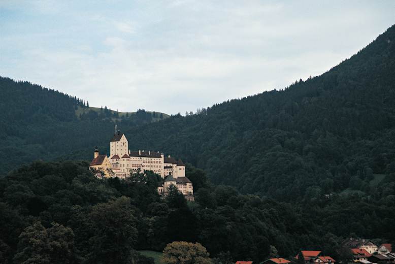 Die Wegführung ist beinahe wildromantisch und das Hindernis besteht aus einer Geröllverblockung, die man dank guter Markierung jedoch leicht überqueren kann. Aus dem Waldstück heraus genießen wir bereits erste Blicke auf die Burg Hohenaschau. An Hohenaschau, 620 m, vorbei gelangen wir zur Talstraße.