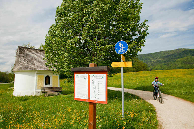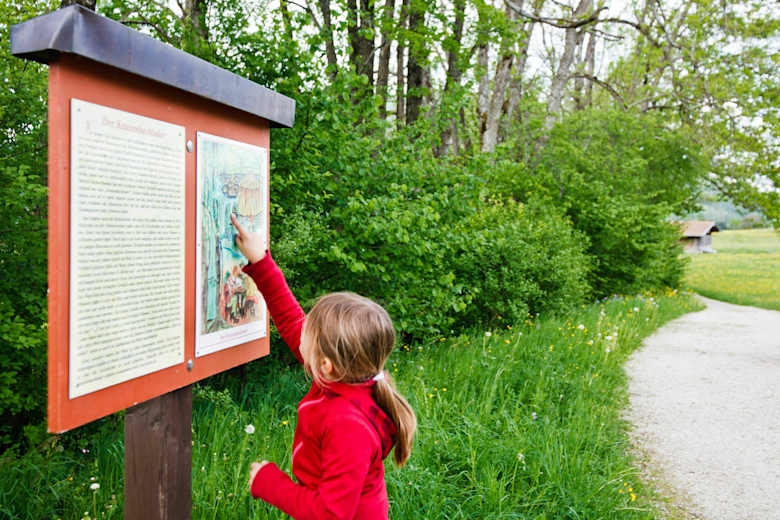 Familien mit Kindern werden auf dem leicht zu gehenden Sagenweg in Ruhpolding im Chiemgau in Oberbayern viel Vergnügen haben. Der kinderwagentaugliche Weg ist gespickt mit Bildtafeln mit geschichtlichen Informationen und Sagen aus der Umgebung. Der geisternde Triftmeister begegnet einem zwischen der Egglbrücke und der Mühlbauernkapelle, und gruseln kann man sich bei der Mär vom Kaxenbachloder, der hier einst umging.