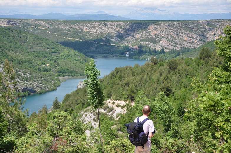 Hoch über dem Krka-Canyon und dem Visovac-See in Kroatien: Bewaldete Höhen, klare Luft, ein bereits kontinentales Klima, aber mit Vegetation, die auch von der Macchia des Küstensaums geprägt ist.
