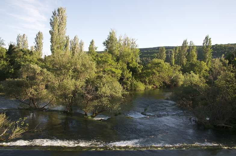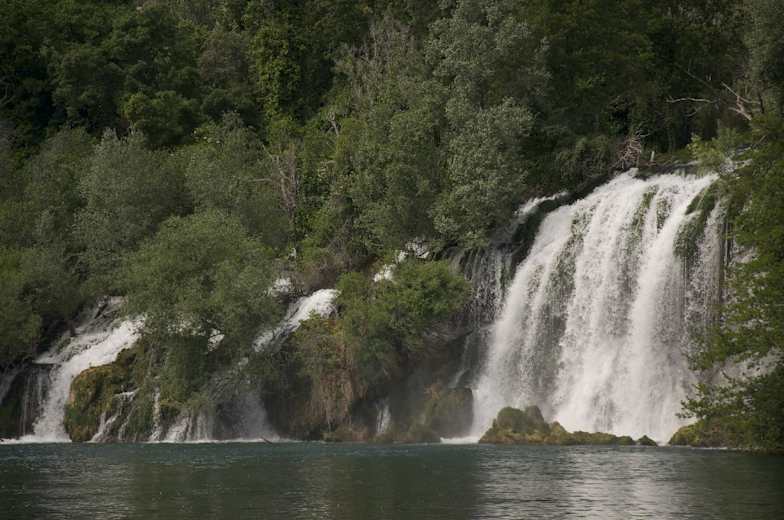 Entlang dem Seeufer spazieren wir durch schattigen Wald und umgeben von üppiger Vegetation auf die Wasserfälle von Roški Slap zu, deren Tosen unüberhörbar ist. Wer Energie hat, sollte sich die Runde nordwärts zu den oberen Kaskaden nicht entgehen lassen. Dazu nehmen wir die nordwärts wegführende Straße, überqueren die Brücke, worauf nach rechts ein Fußweg abzweigt. Dieser führt auf der Fußgängerbrücke über den Krka-Fluss zurück auf die Straße.