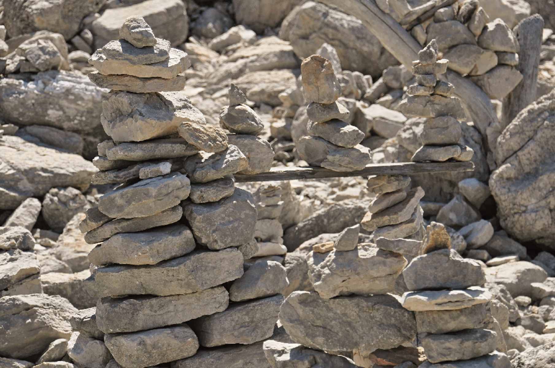 Von hier gehen wir in südöstlicher Richtung noch ein Stück weiter den Klippen entlang. Ein gut auszumachender Fußweg führt in der Folge direkt hinunter zum Mir-See, wo es nach rechts dem Ufer nach weitergeht. Kurz vor der Breitseite reiht sich ein Steinturm an den nächsten Steinmann. Dahinter verbirgt sich ein reizvoller Küstenstreifen, der zum Bade einlädt. Der Salzsee ist hier im Untergrund mit dem Meer verbunden, sodass frisches Meerwasser zufließen kann. Entlang der anderen Seeseite genießen wir erneut diese einzigartige Atmosphäre, welche der Jezero Mir ausstrahlt, bis wir bei der anderen Breitseite nach rechts hinauf abzweigen.