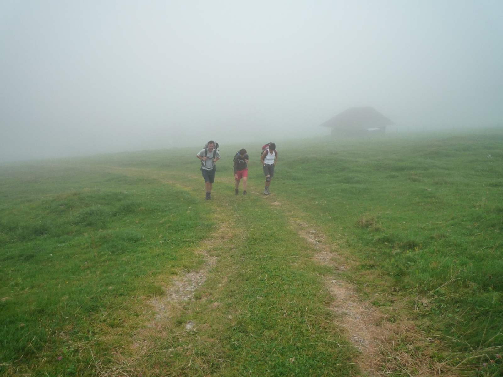 Südwärts in ein paar Schritten hinab auf eine Wiese und links haltend zurück zum Wanderweg. T3+.