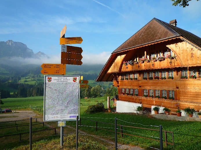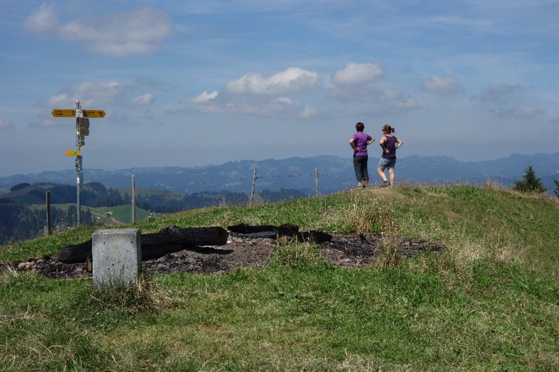 Hinab zum Bauernhof Grosshorben, 1.218 m. Südwärts zuerst wenig ansteigend in der Flanke, dann etwas steiler über den Grat auf den Wachthubel, 1.414 m. Über den grasigen Südgrat hinab in einen Sattel und weiter auf einem Fahrweg, dann Sträßchen, bis die Wanderroute links abzweigt.