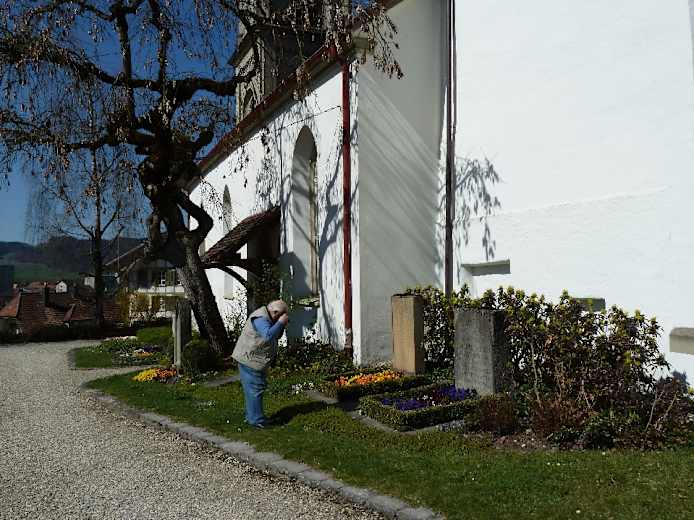 Auf der Straße weiter Richtung Kirche; rechter Hand durch den Skulpturenpark mit bronzenen Gotthelf-Plastiken und zum hohen Gotthelf-Denkmal. Zurück auf die Straße und nach rechts zur Kirche, ca. 600 m; auf der Sonnenseite nebeneinander die Gräber von Jeremias Gotthelf, Emanuel Friedli (in Lützelflüh geborener Dialektforscher, von Gotthelf getauft, bei Gfeller zeitweise wohnend) und Simon Gfeller.