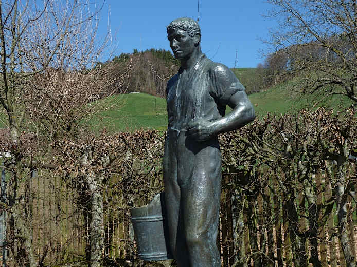 Zurück zu seiner Wirkungsstätte, nach rechts zum Uli-Brunnen beim Schulhaus; die Figur ist „Uli der Knecht“, nach dem gleichnamigen Roman von Gotthelf, den Franz Schnyder erfolgreich verfilmt hat (die Fortsetzung „Uli der Pächter“ ebenfalls).