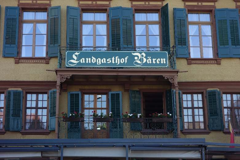 Gegenüber der Kirche der stattliche Landgasthof Bären, 700 m; in der Gaststube der berühmte, uralte runde Tisch, um den sich laut Gotthelfs Novelle „Die Schwarze Spinne“ die Überlebenden der Pest-Epidemie trafen. Südlich des Bären die Trinkhalle mit Ausblick in ein Tälchen, durch das wir absteigen werden.