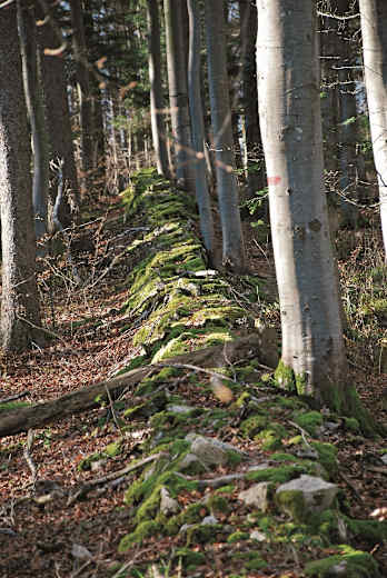 Mehr oder weniger der Grenzmauer entlang, auf einem Weg mal rechts und mal links von ihr, unterhalb der Kuppe P. 1.096 m in einen Sattel, ca. 1.065 m, mit Straße und Spielplatz.