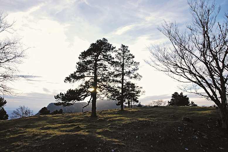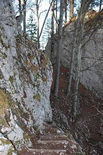 Zurück auf dem markierten Weg und auf der Schattseite in einen Sattel. Gegenaufstieg zu Felsen, auf der Südseite auf- und absteigend, Treppenwege, teils kettengesichert.