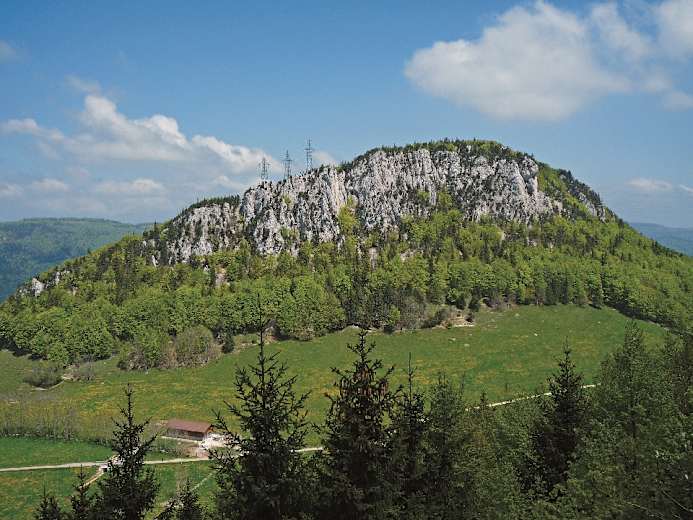 Gipfelglück am Nordrand im Schweizer Kanton Aargau: Der Grenzstein mit der Höhe 1.033 Meter auf der Wannenflue, hoch oben in der Klus von Balsthal, ist der nördlichste Punkt des Oberaargaus. Ihm entspricht der Felskopf 1.188 Meter auf dem Grat des Chamben.