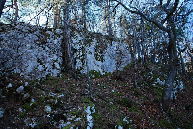 Auf der Schattseite in einen Gratsattel absteigen, wo sich die Wegspur verliert. Vielleicht könnte man von hier südwärts absteigen. Ich stieg durch den Steilwald nordwestwärts ab zum Wanderweg; unten nach links, durch einen Felseinschnitt auf Treppen hinab und hinein in die obersten Hornbachgraben; T5–.