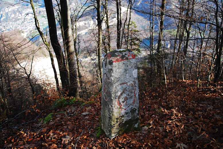 Auf dem anderen Ufer weglos hinauf zu einer Wegspur, die auf der linken Seite durch den Hornbachgraben zieht, an einem großen Grenzstein BE/SO vorbeikommt und leicht ansteigend durch die Flanke einen Grateinschnitt mit Forststräßchen erreicht (Eggli auf der Landeskarte).