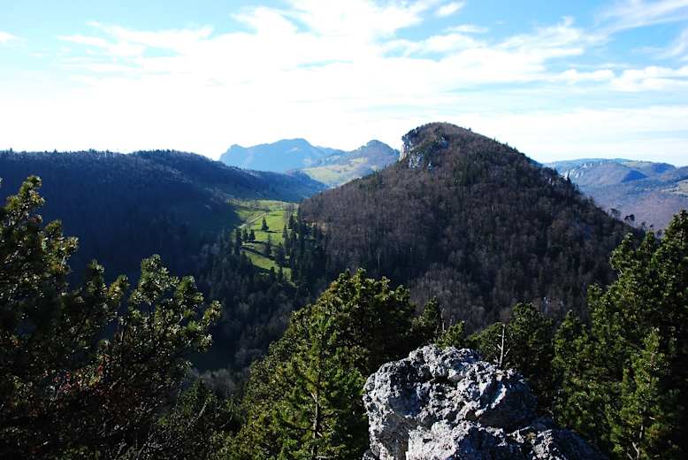Nun auf Wegspuren der Hangkante der Wannenflue entlang, wobei zwei schrofige Aufschwünge etwas rechts der Kante überwunden werden. Unterhalb von P. 905 m steigt man rechter Hand entlang einem Felsband auf. Packender Tiefblick auf die Klus von Balsthal von P. 905 m der Wannenflue.