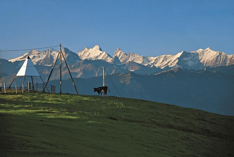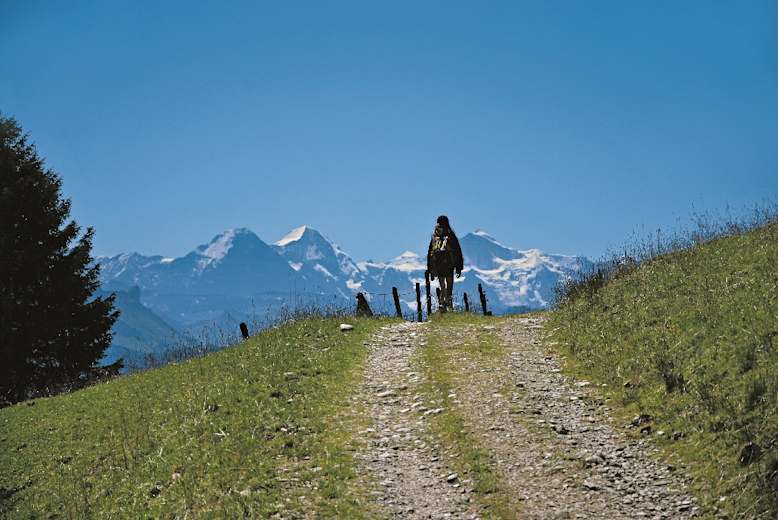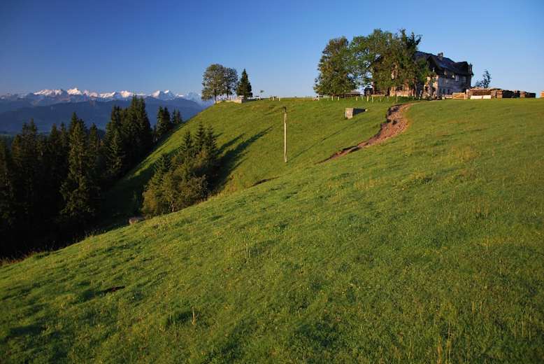 Eine fußballfeldgroße Gipfelmatte mit dem Abgrund rundherum. Je ein Hotel, Bauernhaus, Kioskhäuschen, Materialseilbahn- und Wetterstation, zwei Triangulationssignale, drei Panoramatafeln, viele Tische und Bänke, und noch mehr glückliche Besucher sind in der Umgebung zu finden. Und Kühe, deren Glocken einem am Morgen wecken, wenn die Sonne alle neun 4.000er der Berner Alpen bestrahlt.