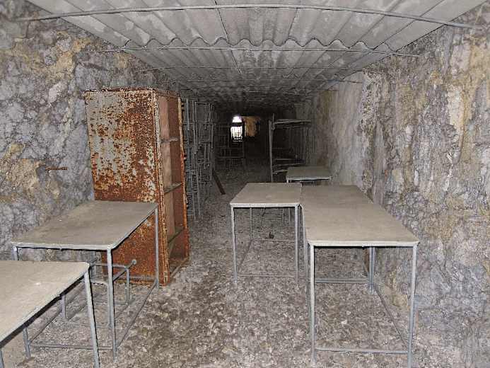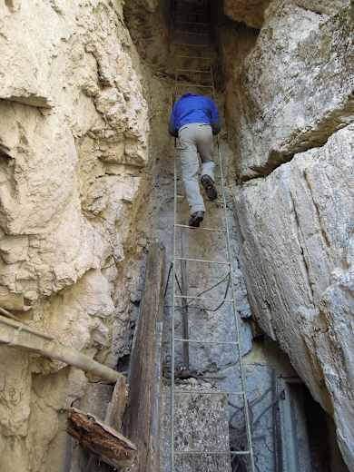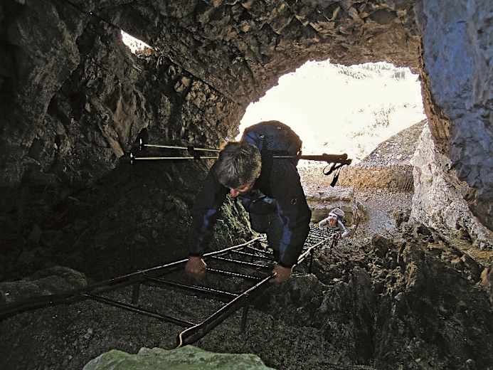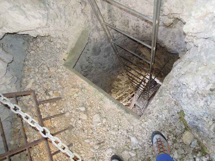 Über eine ca. 8 m hohe Metallleiter hinab in eine natürliche Halbhöhle mit einem Laufgraben, der sich in der Südwand des Achs verliert, sowie mit zwei abzweigenden, sich teils verzweigenden Gängen, an deren Enden man tolle Ausblicke ins Tal der Emme hat; vom rechten Stollen (für den eine Taschenlampe nützlich ist) geht’s über eine Leiter nochmals rund 9 m in die Tiefe und dann nach vorne in die senkrechte Westwand des Achs – hier befand sich wohl die Toilette, wie das Loch im Boden vermuten lässt.