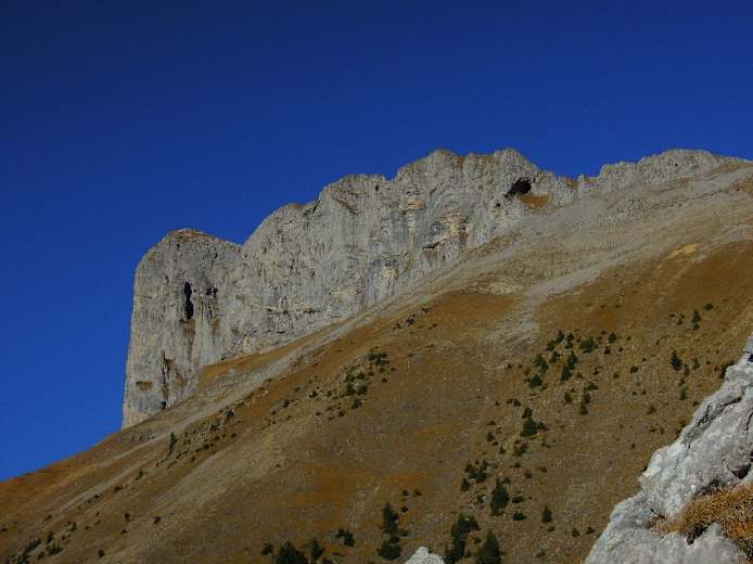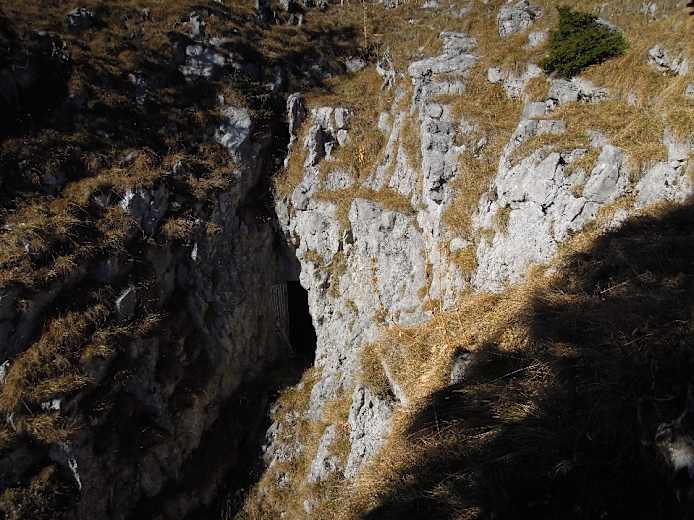 Rechts ein kurzer Laufgraben, ein paar Meter später ein gemauerter Eingang zu einem kurzen, halb verschütteten Stollen. Nun am besten noch rasch auf den höchsten, felsigen Gipfel des Achs, 1.701 m (früher die Ax genannt). Der Eingang zum Infanteriewerk befindet sich vorne an der Abbruchkante der geneigten, großen Gipfelweide, rechts einer kräftigen Tanne, auf ca. 1.680 m (also nicht ganz zuvorderst auf der luftigen Gipfelweide des Achs!). Sehr ausgesetzte Abwärtsquerung zum Eingang; auf halbem Weg steckt ein Haken, in den man am besten einen Karabiner mit einem Seilstück klinkt, weil die zwei letzten Meter zum Eingang heikel sind.