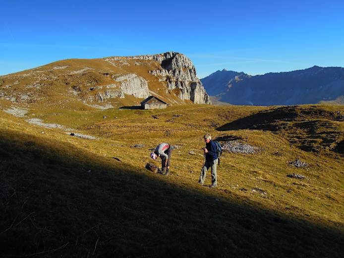 Abstecher von der Chlushütte ostwärts zu Felsen mit Kletterrouten und einer Naturhöhle, die zum Unterstand umfunktioniert wurde (Eingang versperrt). Dann hinauf auf den grasigen Nordrücken der Böli, wobei der Zugang zum höchsten Punkt, 1863 m, zuletzt ziemlich schmal ist.