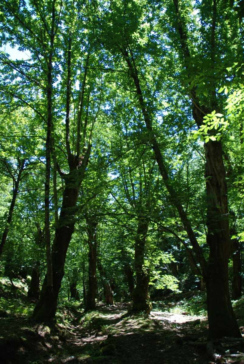 Nach dem Weiler nimmt uns wieder ein schöner Weg durch Kastanienwald auf. Nach einem leichten Abstieg gewinnt der Weg wieder an Höhe und schwenkt nach links, in eine offenere, mit locker stehenden Steineichen fast mediterrane Landschaft. D