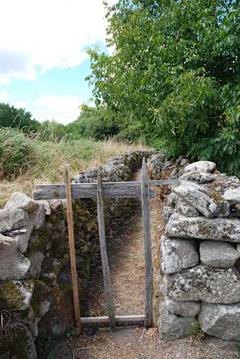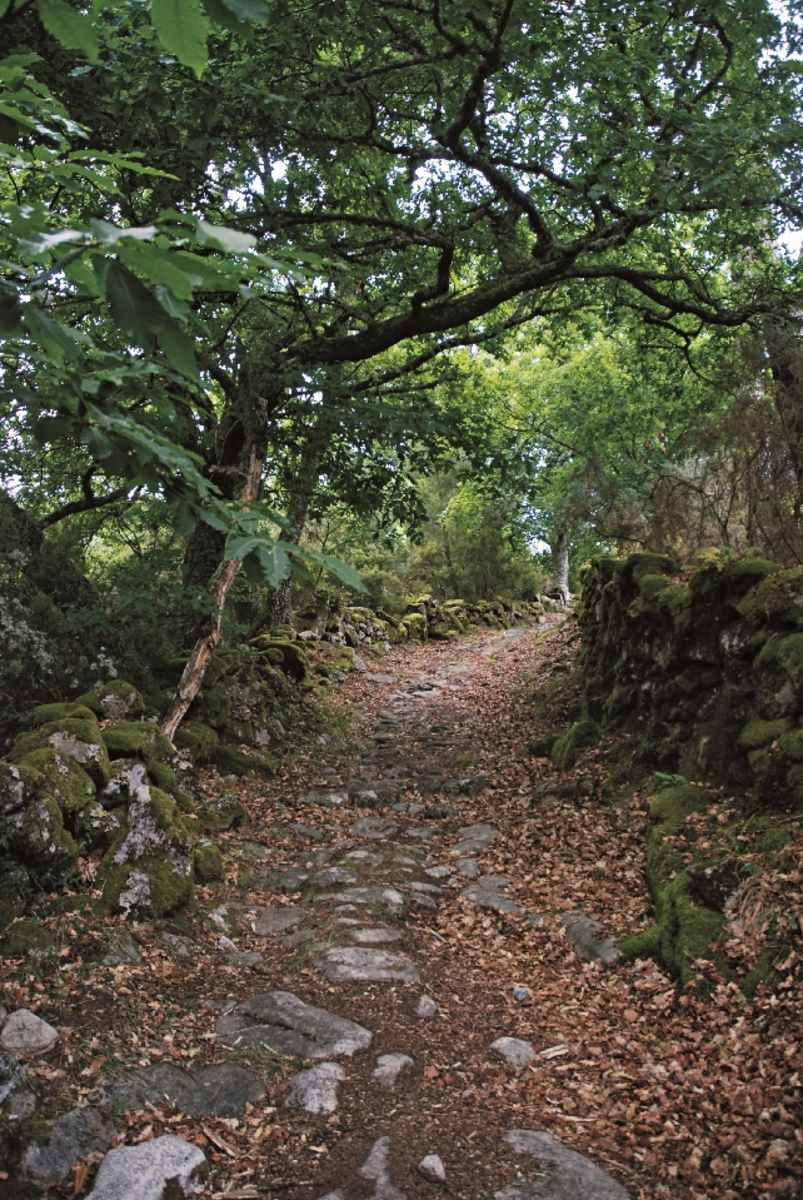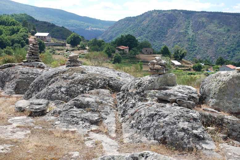 Im Rechtsbogen gelangen wir zur Straße Parada de Sil – Campingplatz, gehen links und verlassen sie nach wenigen Metern in der Linkskurve geradeaus auf dem Wanderweg. Im offeneren Gelände lässt sich nach Norden das Tal des Río Sil erahnen. Bei der Gabelung knapp 500 m nach der Straße schlagen wir den Weg ganz rechts ein.