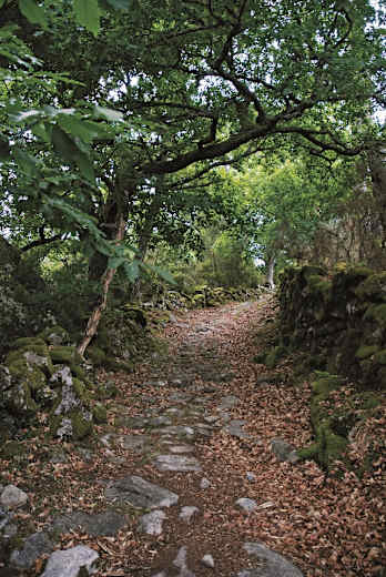 Nach gut 500 m, kurz nach der Linkskurve, schlagen wir den Waldweg nach rechts ein und wandern zwischen alten Feldmauern und auf grobem, altem Pflaster bergan. Nach einem kurzen, offenen Stück geht es wieder in leichtem Auf und Ab durch Wald.