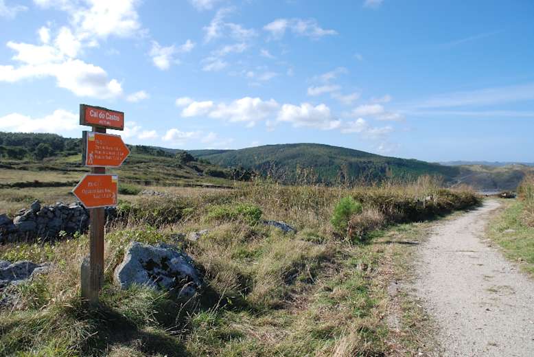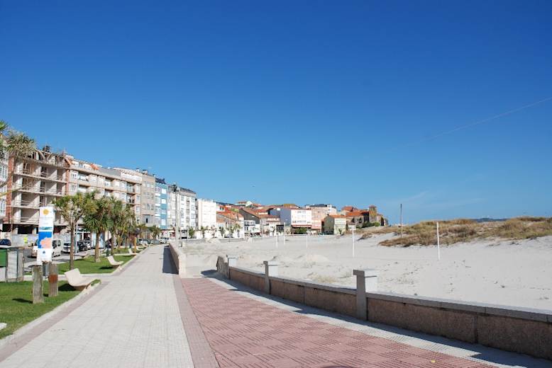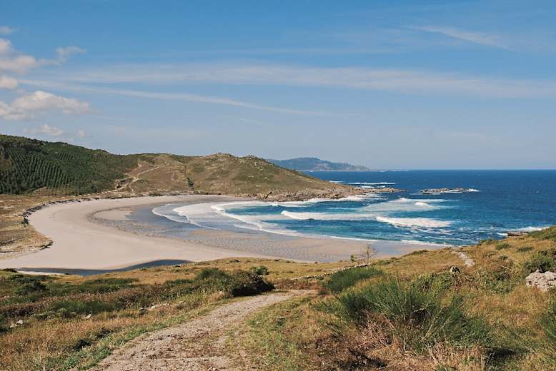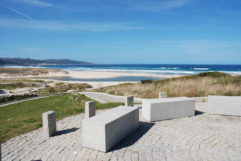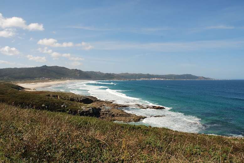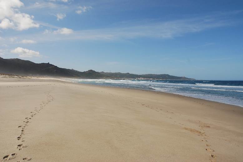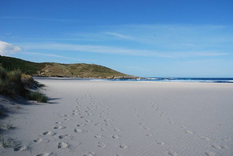 Über einen kleinen Pass geht es erst zur geschwungenen Sandbucht der Praia de Soesto und dann, erst auf einem schmalen Küstenpfad, später auf einem Schottersträßchen, zur 2,5 km langen Praia de Traba. Sie wird von einem Dünengürtel abgeschlossen, dahinter liegt die kleine Lagoa de Traba, ein besonders für Vogelfreunde interessantes kleines Feuchtgebiet.