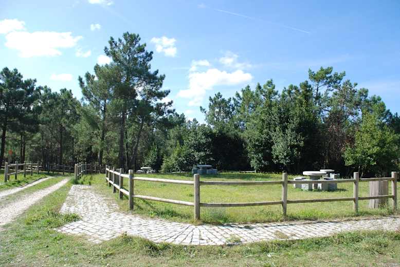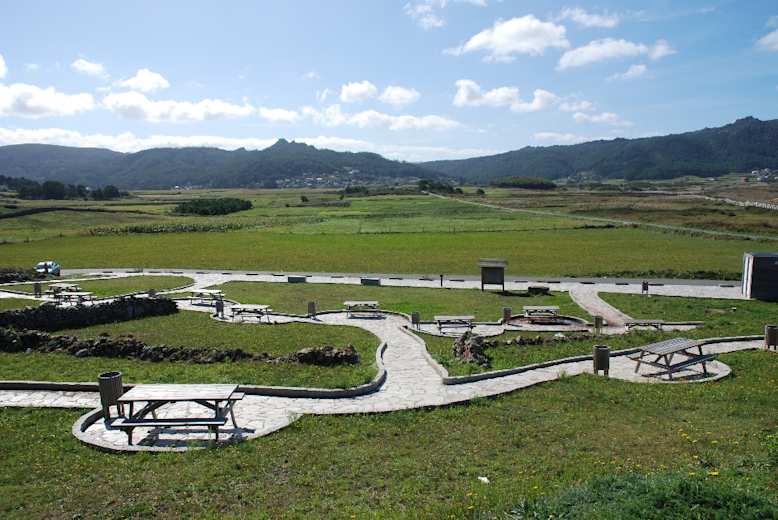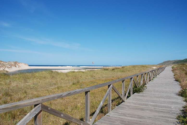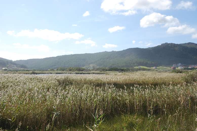 Hier biegen wir rechts ab, bald wird die Fahrspur zu einem Waldweg, in dessen Linkskurve folgen wir geradeaus dem Pfad. Nach knapp 500 m ignorieren wir den Pfad rechts und schwenken stattdessen nach links auf den bereits sichtbaren Picknickplatz oberhalb der Praia de Traba zu (Sitzbänke, Tische, Brunnen und WC). Von hier führt uns ein Holzsteg in 10 Min. durch das Feuchtgebiet zum Vogelbeobachtungspunkt an der Lagoa de Traba. Unterwegs erklären Schautafeln die Flora und Fauna, die kleine Lagune selbst versteckt sich unter Umständen hinter einem üppigen Schilfgürtel.