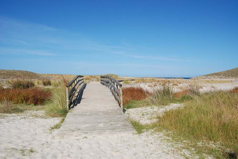 Direkt neben dem Ausguck führt ein Pfad nach rechts durch die Dünen zum Strand. Sofern keine Flut herrscht (dann ist die Flussmündung am Nordende des Strandes unpassierbar. Gefährliche Strömung! In diesem Fall Rückkehr auf dem Holzsteg), kann man auch direkt am Ufer zum Picknickplatz zurückkehren bzw. erst noch ein Stück nach Südwesten spazieren. Auf dem Rückweg kann man ab der Praia de Arnado links den bekannten Pfad nehmen oder geradeaus gehen.