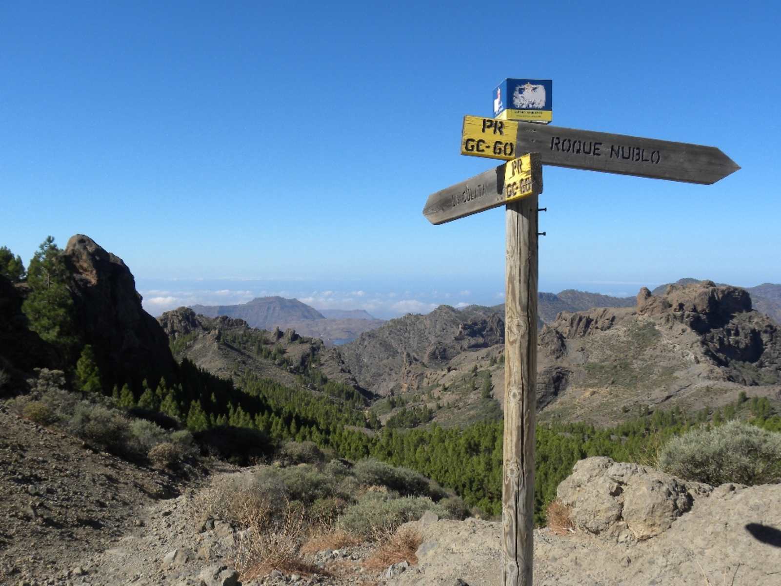 Der Weg leitet uns an Ginsterbüschen und Kiefernbäumen vorbei in 700 m zur Gabelung am Pass Degollada Blanca . Wir ignorieren den Rechtsabzweig nach La Culata und bleiben stets unterhalb der steilen Felswand des Roque Nublo. Nach einer weiteren Linkskurve genießen wir eine fantastische Aussicht auf das Zentrum und den Westen der Insel: Im Vordergrund die Barrancos rund um den Roque Bentayga, dahinter die Hochebene von Acusa mit dem kantig aufragenden Massiv des Altavista. Wir gehen weiter um den Roque Nublo herum und kommen zur Gabelung Hoyetas del Nublo, ein kleines Schild verkündet La aventura comienza en ti („Das Abenteuer beginnt in dir“). Geradeaus weist ein Schild nach El Aserrador.