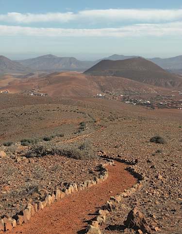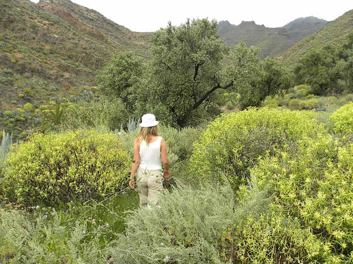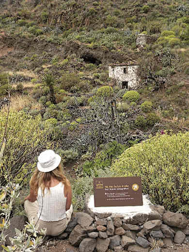 Wenn die Steinpflasterung aufhört, gehen wir auf einem schmalen Erdpfad weiter, der am Rande einer kleinen Seitenschlucht entlangführt. An der nächsten Gabelung gehen wir nicht geradeaus zur Mühle Molino Viejo, sondern halb rechts hinauf, vorbei an der links unter uns liegenden Mühle Molino del Mundillo. Vorübergehend entfernt sich der Weg von der Abbruchkante und führt in weitem Bogen an verwilderten Olivenbäumen und mannshohen Tabaiba-Büschen vorbei zu einem verlassenen Stall.