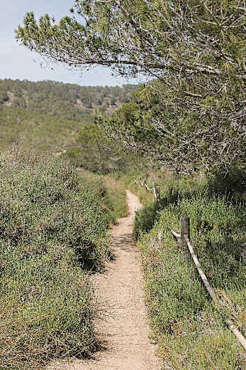 Man kann nun dem FKK-Sandstrand barfuß einen Kilometer nach Norden folgen oder die interessante Alternative hinter dem Dünengürtel nehmen. Sofern diese gewählt wird, gehen wir etwa 50 m nach dem Chiringay links und an der nächsten Gabelung dann rechts auf einem mit einem Seilgeländer eingefassten, schön angelegten Weg weiter. Dieser führt zunächst durch einen dichten Kieferngürtel und dann zwischen den Dünen und Salinen entlang.