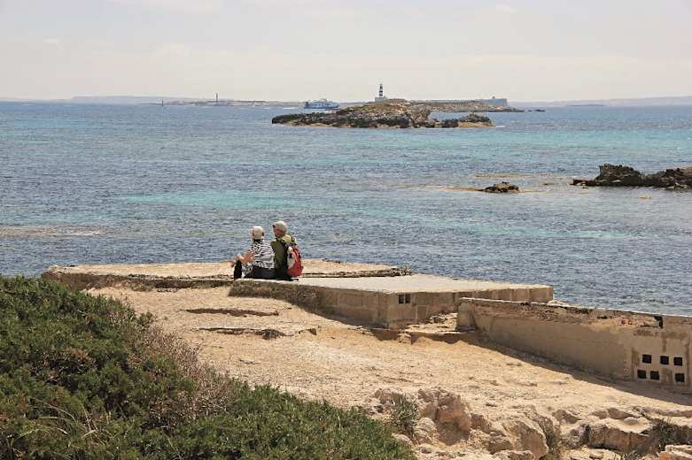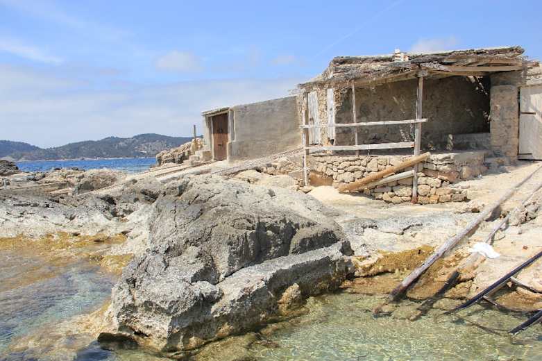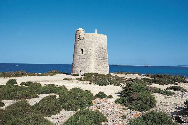 An der südöstlichsten Spitze der Insel wird schließlich der Torre de ses Portes erreicht. Bei dem Wehrturm gibt es ein paar Bootshäuser, auf deren Flachdächern man rasten und die Fünf-Sterne-Aussicht hinüber auf die vorgelagerten Leuchtturminseln und die schemenhafte Silhouette von Formentara genießen kann.