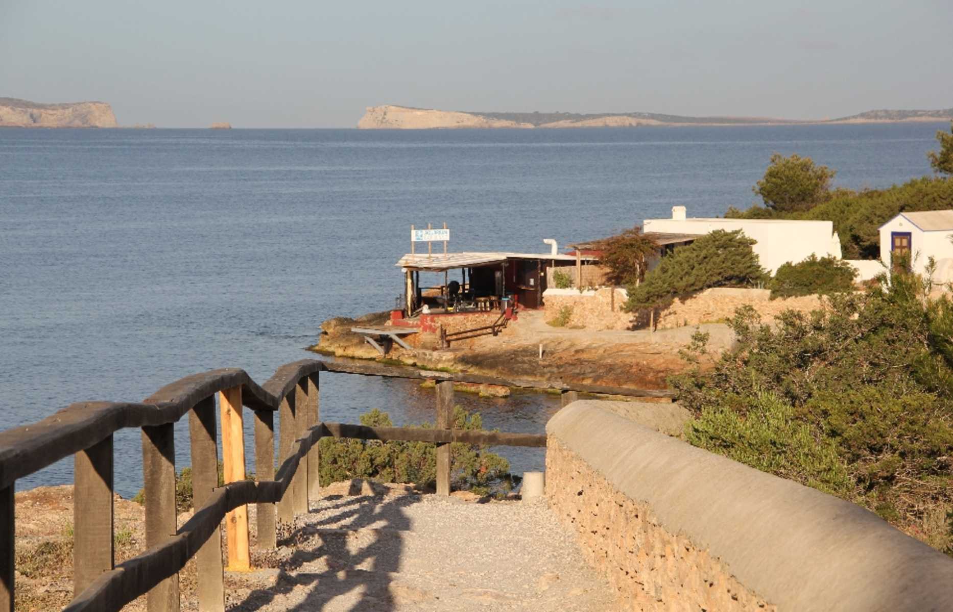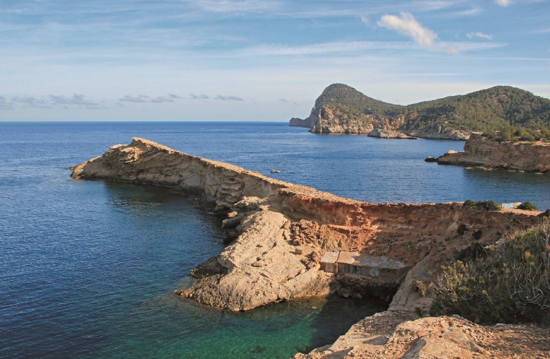 Wir wandern an der felsigen Küste entlang und genießen die Aussicht auf die Bucht von Sant Antoni und die vorgelagerte Leuchtturminsel Sa Conillera. Nach zehn Minuten schwenkt der Pfad nach rechts weiter an der steiler werdenden Küste entlang. Eine kleine Bucht wird umlaufen, von der sich schon das auf eine Landzunge platzierte kleine Aquarium zeigt (Eintritt, in der Saison täglich ab 10 Uhr bis Sonnenuntergang geöffnet).