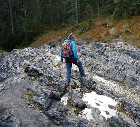 An einer markanten Rechtskurve verlässt man sie und folgt dem alten Weg, der die weit nach Osten ausholende Schleife der Straße abkürzt (nach Regen ziemlich matschig). Bei der Stierschlaghütte stößt man wieder auf die breite Fahrspur. Sie zieht hinab zur Dürrach, deren Geröllbett hier aufgestaut ist, steigt dann an der gegenüberliegenden Talseite an zur Talstraße. Auf Asphalt (Tiefblicke in die Dürrachklamm) hinaus zur großen Brücke über den Fluss und zurück nach Fall.