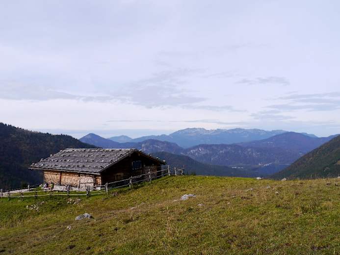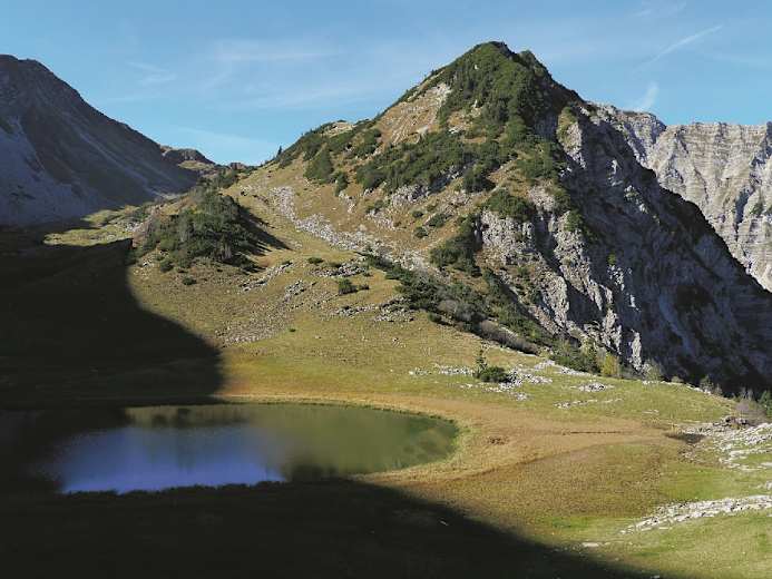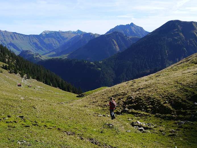 Nach dem langen, schattigen Aufstieg ist in der grünen Mulde ein Sonnenbad fällig. Anschließend steigt man, von deutlichen Markierungen geleitet, ostwärts auf zu dem Wiesensattel, ca. 1.630 m, der den Übergang ins Bächental vermittelt. Im Rückblick zeigt sich die Tölzer Hütte. Dahinter geht’s über Wiesen hinab zur Delpsalm, 1.570 m.
