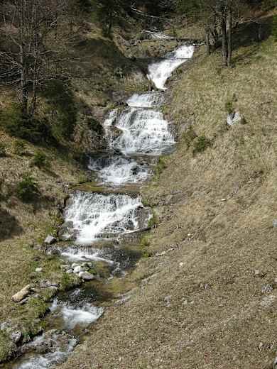 Der Weg zickzackt rechts des feuchten Spektakels steil bergan, führt dann hoch über dem Glasbach flach zur Peterer Alm, 1.086 m, deren Hütte rechts oberhalb liegt. Dahinter geht’s über den Klausbach; wenig höher bildet der Glasbach eine Folge von hübschen Treppenkaskaden. Den roten Punkten folgend steigt man auf schlechter Wegspur ziemlich direkt an zur Glaswandscharte, 1.324 m, dabei erst den Endpunkt einer Forstpiste tangierend, dann eine zweite Straße bzw. den Höhenweg kreuzend, der die Staffelalm mit der Tanneralm verbindet.