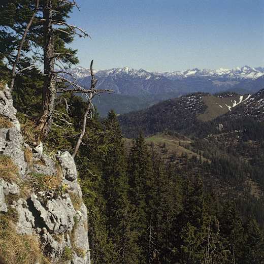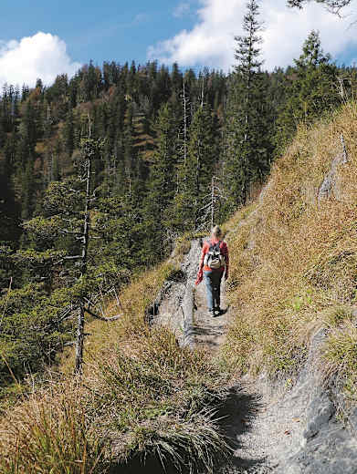Der Westweg herauf aus dem Tal der Großen Laine: Von den Aufstiegen auf die Benediktenwand (1.800 m) ist jener besonders reizvoll, der seinen Ausgangspunkt im Ort Jachenau in Bayern hat. Er folgt dem Graben der Großen Laine bis hinauf zu ihrer Quelle unter der Glaswandscharte, wo man nach Osten umbiegt und erst im Wald, dann durch ausgedehnte Latschenfelder den Gipfel anpeilt.