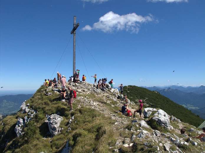 In der bewaldeten Senke biegt der Weg nach rechts um; in kurzen Kehren gewinnt man rasch an Höhe. An der Abzweigung zur Tutzinger Hütte, ca. 1.560 m, bleibt der Wald zurück, taucht der Weg ein in die Latschenfelder. Die versperren zunächst noch den Blick zum Gipfel; erst an einem kleinen Grateinschnitt wird das große Kreuz der Benediktenwand, 1.800 m, sichtbar.