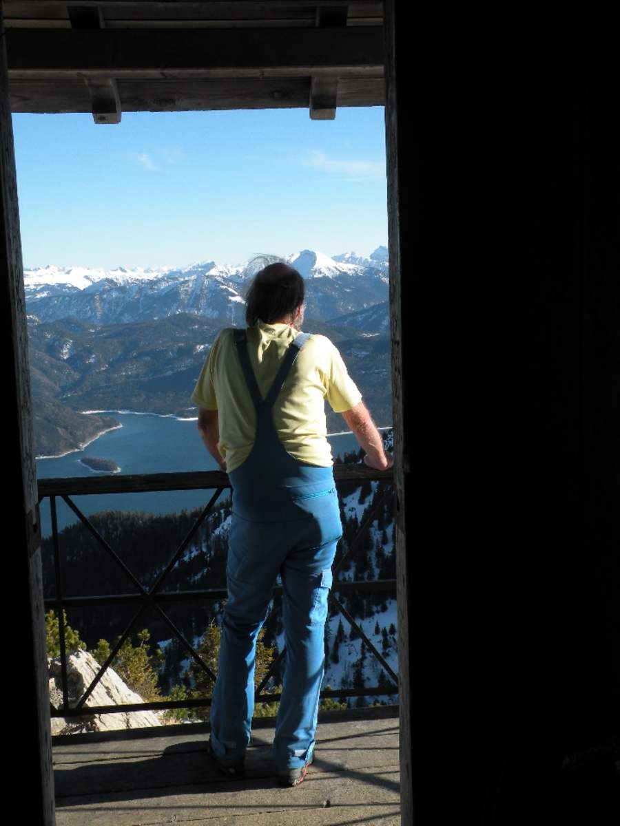 Von der Bergstation am Fahrenbergkopf wandert man auf komfortablem Weg flach hinüber zum Herzogstandhaus, 1.573 m. Dahinter geht’s ansteigend durch die Ostflanke des Martinskopfs und über ein paar weit ausholende Serpentinen an dem latschenbedeckten Hang hinauf zum Herzogstand, 1.732 m, den ein Kreuz und der hölzerne Pavillon aus der Zeit des bayerischen Märchenkönigs zieren.