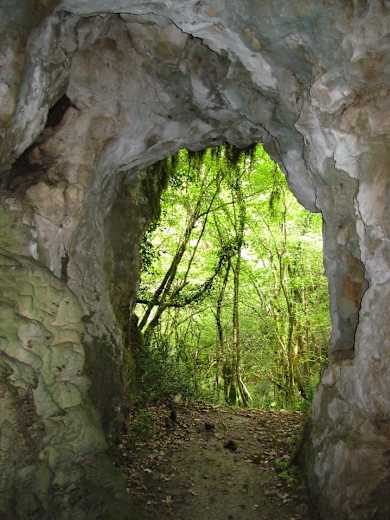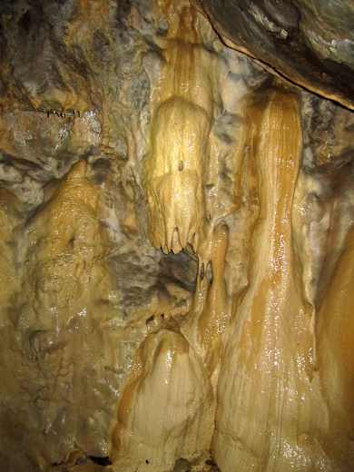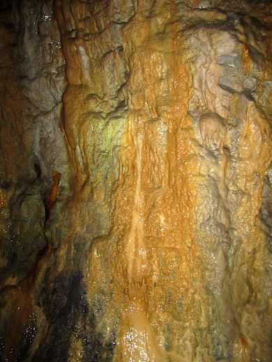 Wir gehen auf einem wieder rot-blau markierten, ansteigenden Fußweg bergauf. Dieser biegt sich in ein schmales Seitental hinein, und schon nach knapp 10 Min. Aufstieg kommen wir zu einem kleinen Wasserfall, neben dem sich der Eingang zu einem historischen Bergwerksstollen befindet. Diesen kann man, Lampe vorausgesetzt, erkunden – es lohnt sich! Schon im vorderen Teil sieht man schöne Tropfsteine, und weiter hinten im etwa 30 m langen Gang funkeln Mineralien an den Wänden.