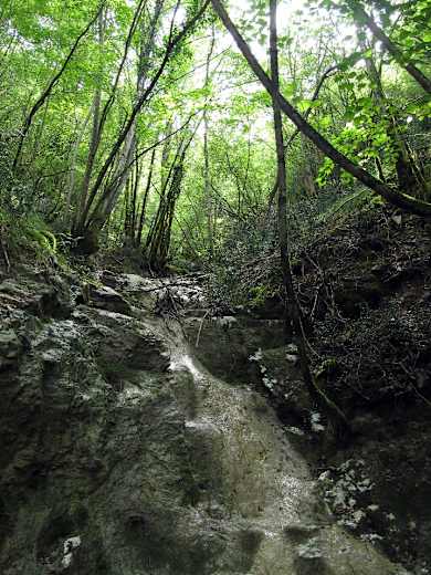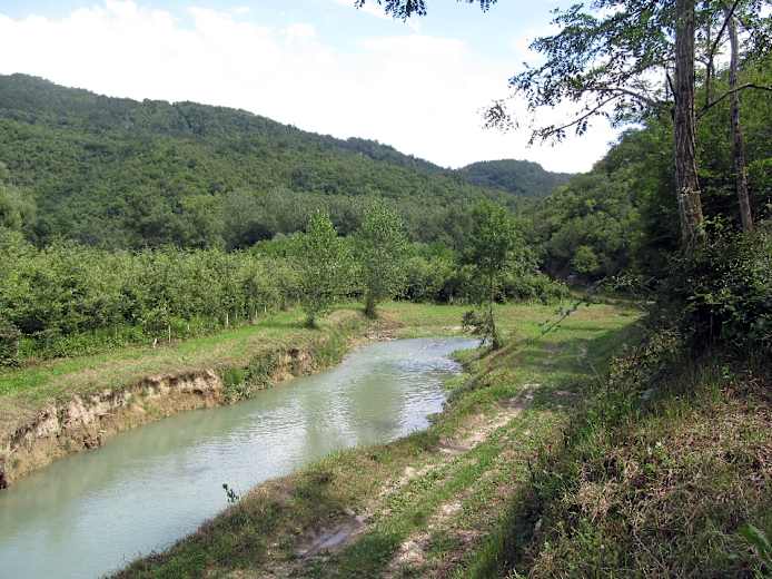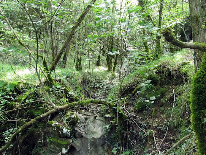 Es geht in ein Tal hinein, dort über ein kleines Bächlein und am Gegenhang entlang wieder ansteigend weiter. Bei einer Gabelung ist sowohl der bergauf führende Fußpfad als auch der nur leicht ansteigende Fahrweg markiert, sie treffen aber auch wieder zusammen, sodass es egal ist, welchen man nimmt. Bei den Ruinen des verlassenen Weilers Brkani (nicht angeschrieben) treffen wir auf eine Schotterstraße, auf der wir gerade weitergehen. Wir bleiben auf ihr (rechts bergauf, nicht auf dem Fußweg geradeaus leicht bergab) und kommen ins Dorf Podrebar. Dieses durchqueren wir und gehen, nun auf Asphalt, eben dahin.