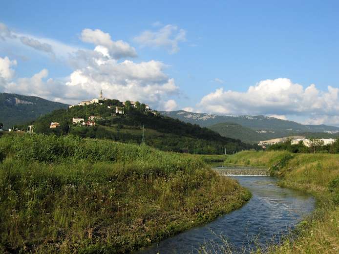 Buzet, Ortsteil Most bei der Brücke über die Mirna, 45 m; von der Hauptstraße Buzet–Umag unterhalb der Altstadt Richtung Pazin abbiegen. Vom Busbahnhof Buzet 20 Min. pro Richtung zusätzlich.