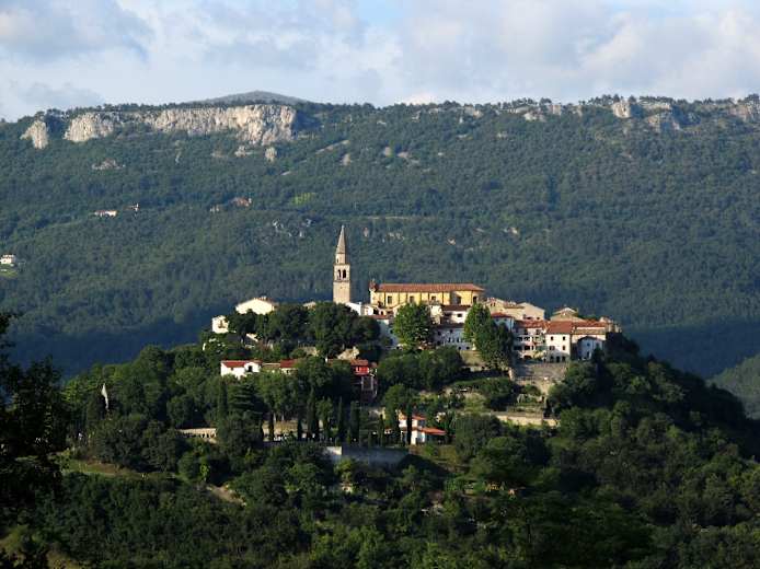Rund 10 Min. später biegt die Markierung rechts ab und führt über eine Wiese steil bergauf. An einem Zaun entlang geht es nach links eben dahin, dann am Ende der Wiese wieder rechts steil bergauf in den Wald. Nochmals knickt der Weg nach links und wir kommen zu einem neu restaurierten, einzeln stehenden Haus. Unterhalb davon links bergab und gleich wieder rechts unterhalb eines Weingartens eben auf einen großen Baum zu. Bei diesem links bergab; wir treffen schließlich auf einen Schotterweg und auf diesem, unterhalb eines Hauses, auf Asphalt. Dieser schmalen Asphaltstraße folgen wir nun für den Rest der Tour. Sie führt uns durch mehrere Weiler hindurch, zuletzt mit herrlichem Blick auf Buzet, hinab ins Tal zur Kreuzung beim Fabriksgelände, von der wir die letzten Meter auf bekanntem Weg zur Konoba Most zurückgehen.