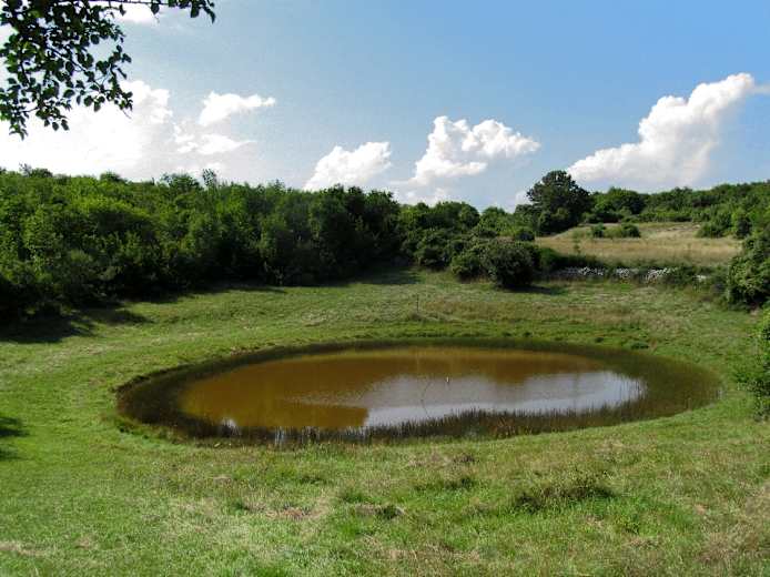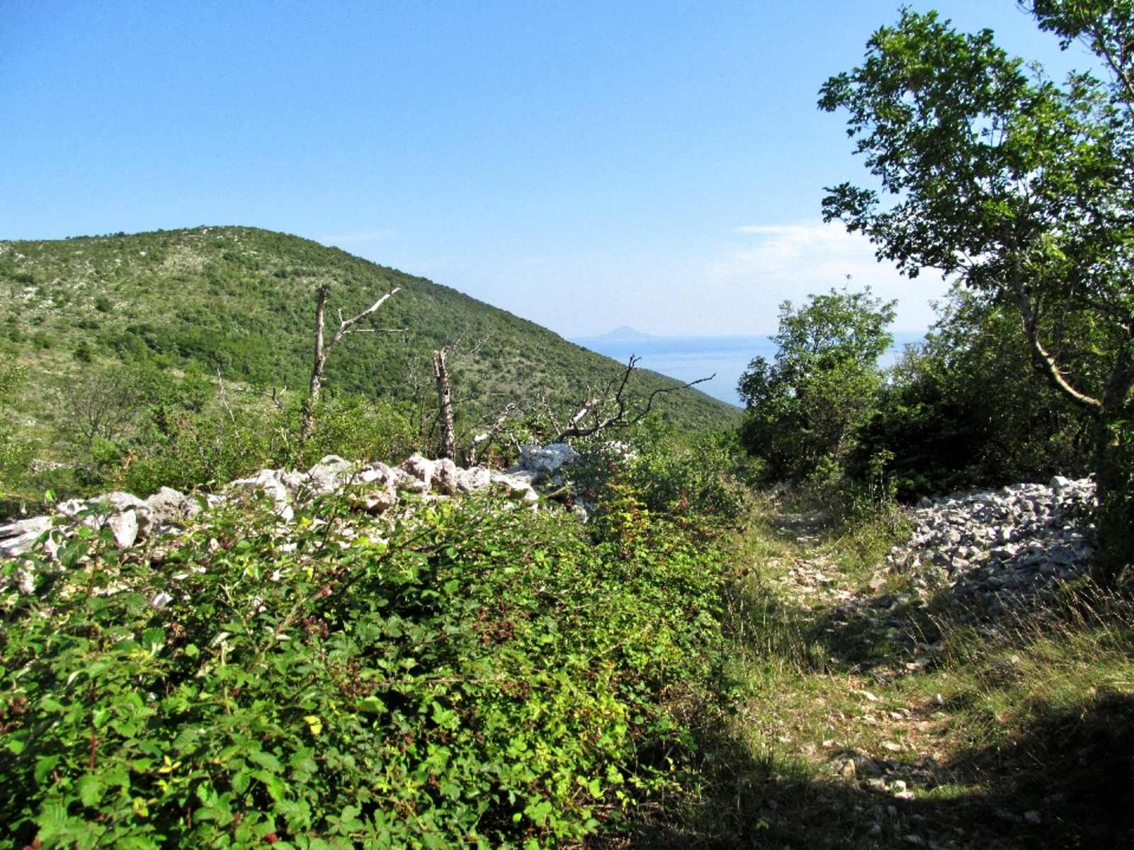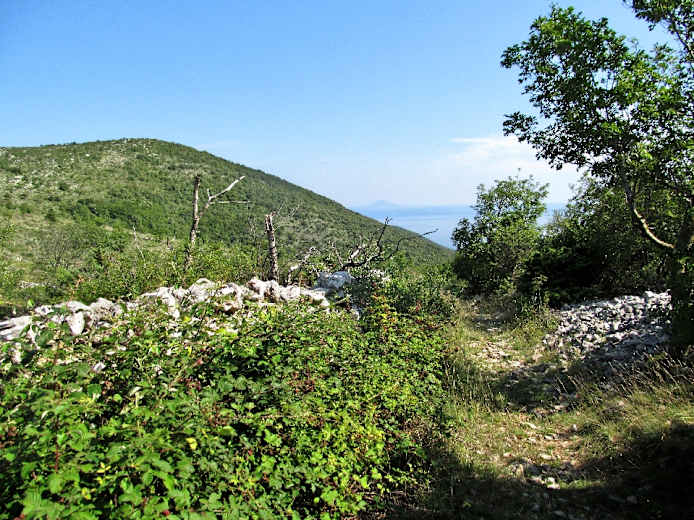 An der Weggabelung in Brovinje ist der Weg geradeaus am Boden mit zwei rot-gelben Kreuzen versperrt; ein Schild weist links auf der Asphaltstraße Richtung Skitača und Ravni. Hier gehen wir bergauf, biegen aber schon nach 100 m wieder links auf einen alten Fußweg entlang von Steinmauern ab. Nach 250 m halten wir uns rechts und kreuzen zweimal einen anderen Weg. Es geht sehr steil und grobschottrig weiter bergauf. Von links mündet ein etwas weniger steiler Weg ein; kurz darauf flacht auch unser Weg ab und verläuft an der linken Flanke des Berges in ein kleines Tal hinein. Entlang einer Steinmauer führt der Weg nun kurz bergab und wir erreichen den kleinen See Veli Kal, an dem wir uns, der Markierung folgend, rechts wenden.