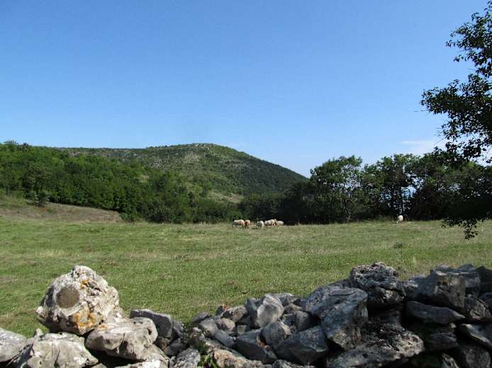 Auf Grasboden gehen wir wieder aus dem Tal hinaus, steigen – nun wieder steiniger – leicht an und kommen schließlich rechts haltend zu einer Einmündung in einen breiten Weg, auf dem wir Markierungen des Weitwanderweges LPP finden. In die Richtung, aus der wir kommen, weist ein Pfeil am Stein Richtung Brovinje. Hier gehen wir rechts bergauf, und 10 Min. später gibt es wieder eine Abzweigung, wo eine Schrift auf einem Stein rechts Richtung Sv. Lucija zeigt.