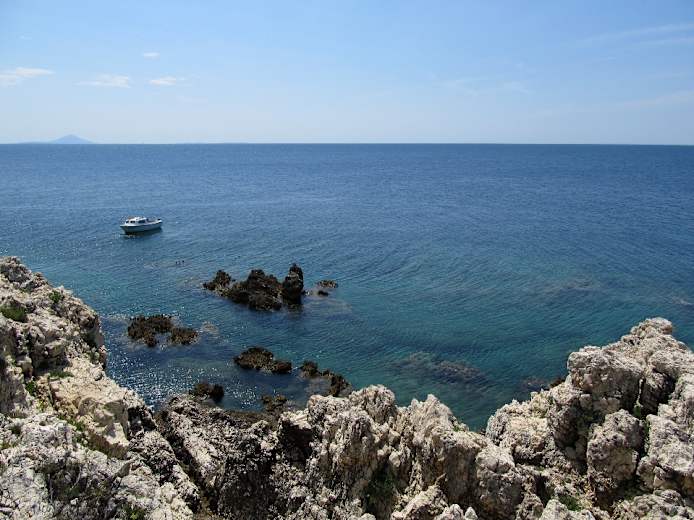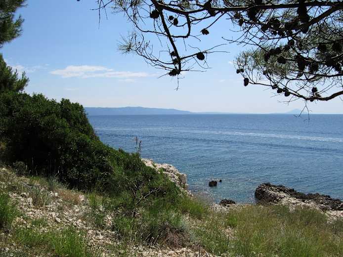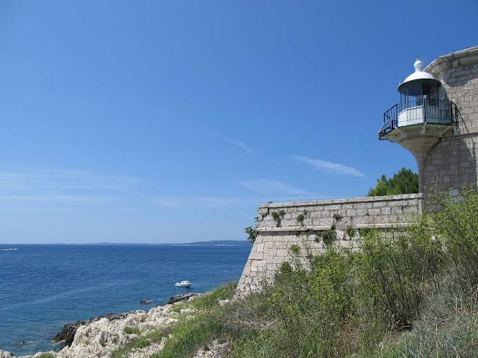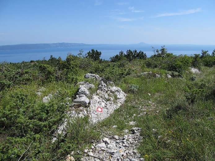 Jenseits des Meeres sind die Inseln Cres und Lošinj schön zu sehen. Knapp über dem Meer wird der Weg wieder flacher und geht in einen Fußpfad über, der uns schließlich direkt zur Landspitze Crna Punta führt. Das Leuchtturmwärterhaus ist Privatbesitz; wer rasten möchte, sollte dies deshalb nicht auf den Bänken hier, sondern ein Stück weiter an der Küste tun, wo man auch bei ruhiger See von den Klippen ins Meer baden gehen kann. Direkt beim Haus befindet sich ein Kontrollstempel des Weitwanderwegs, der hier endet – ab jetzt ist der Weg nur mehr sehr spärlich markiert.