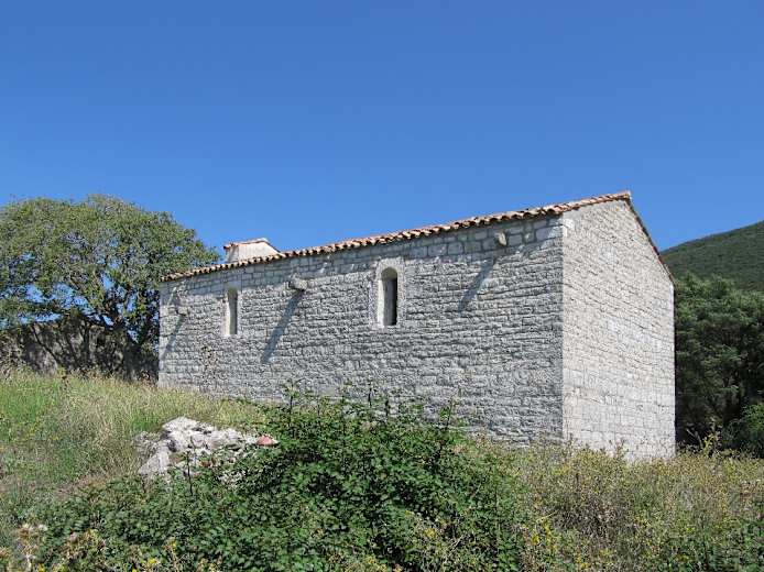 Auf einem steinigen Weg geht es nun bergab auf Häuser zu. Wir treffen auf einen Fahrweg, gehen an teilweise verfallenen Gebäuden vorbei und kommen neben dem Friedhof in den Ort Skitača, wo sich neben der Kirche der heiligen Luzia unter einem riesigen alten Baum ein schöner Rastplatz befindet. Wir gehen auf der Asphaltstraße rechts und biegen nach 50 m links bergab auf einen Fußweg entlang von Häusern ab. Er ist deutlich markiert, führt zwischen Buschwerk und Steinmauern durch eine Senke und steigt dann kurz leicht zurück zur Straße an. Diese queren wir und gehen durch niedrigen Bewuchs am Hang entlang leicht bergab, um nach 500 m abermals auf die Straße zu treffen.