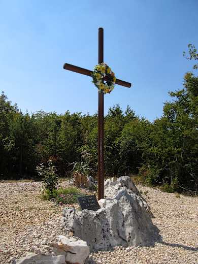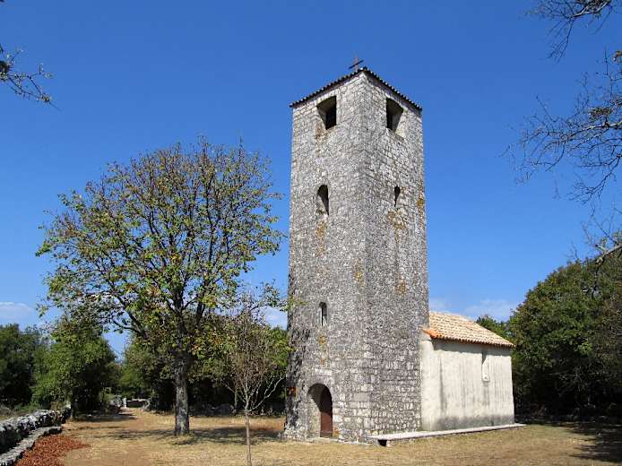 Wir setzen den Weg geradeaus fort und kommen auf eine Schotterstraße. Bei der nächsten Gabelung links, auf einen Mobilfunkmast zu. Kurz hinter diesem ist einige Meter links der Straße ein Kreuz zu sehen, das dem heiligen Veit gewidmet ist – so wie die hübsche Kirche Sveti Vid Dobrinjski, zu der wir wenige Minuten später kommen. Der schattige Kirchhof lädt zu einer kurzen Rast ein, bevor wir gerade weitergehen und auf die Straße Dobrinj–Šilo stoßen.