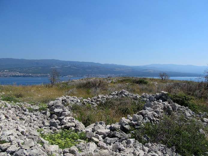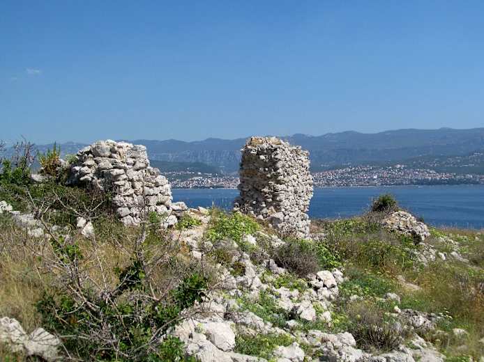 Unsere Tour beginnt direkt an der Strandpromenade in Šilo, auf der wir nach rechts entlanggehen, bis eine rot-weiße Markierung nach etwa 350 m rechts durch eine kleine Straße bergauf führt. An der nächsten Gabelung weist ein Schild Richtung „Rimske Vile“ (römische Villa), dem wir zunächst noch auf Asphalt, dann auf einem Feldweg folgen. Auf einem nach knapp 300 m links abzweigenden Fußpfad können wir einen Abstecher zu den Ruinen machen, bei denen es sich in Wahrheit um die Überreste einer byzantinischen Festung handelt.
