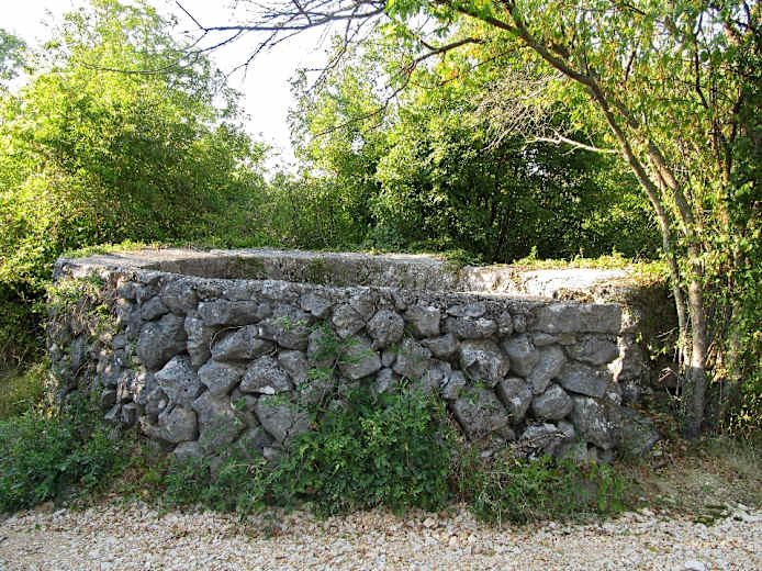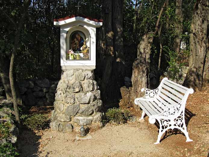 Vom Zentrum auf einem der bergab führenden Wege (sie münden alle ineinander) in ein Tal hinunter und drüben, nach wie vor gut markiert, bergauf zu einer Abzweigung. Hier geradeaus weiter auf einem schönen alten Hirtenpfad. Dieser führt uns nach Gornja Hlapa, wo wir unter einem Haus hindurchgehen, den Ort auf Asphalt durchqueren und bei einem Bildstock wieder auf einen Hirtenweg abbiegen (davor Box mit Stempel, Kontrollpunkt 6 eines lokalen Wanderweges).